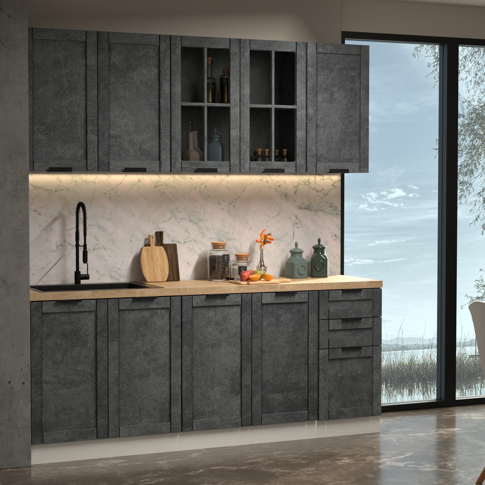 Кухня КИОТО МДФ 2 м БЕТОН ГРАФИТ/БЕТОН ГРАФИТ/КОРПУС БЕЛЫЙ без ст-цы